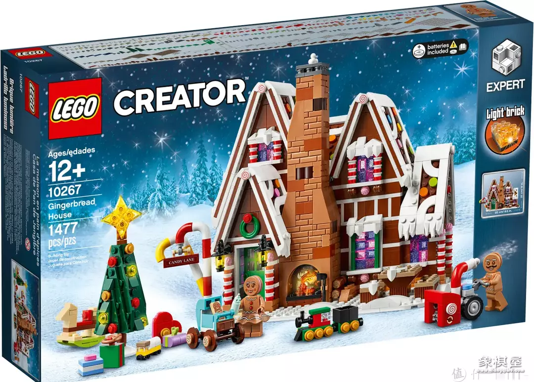 特色:姜饼屋、姜饼人一直是圣诞节必备的装饰甜品,10267就是采用姜饼屋造型设计的,这款套装包含二层尖顶小屋、圣诞树、礼物、玩具等等,屋子背面是开放式结构,壁炉有灯光件、支持点亮效果,非常适合作为儿童的圣诞节礼物,拿来过家家玩。