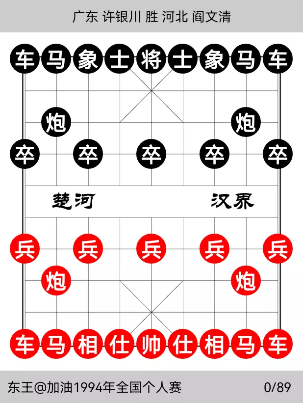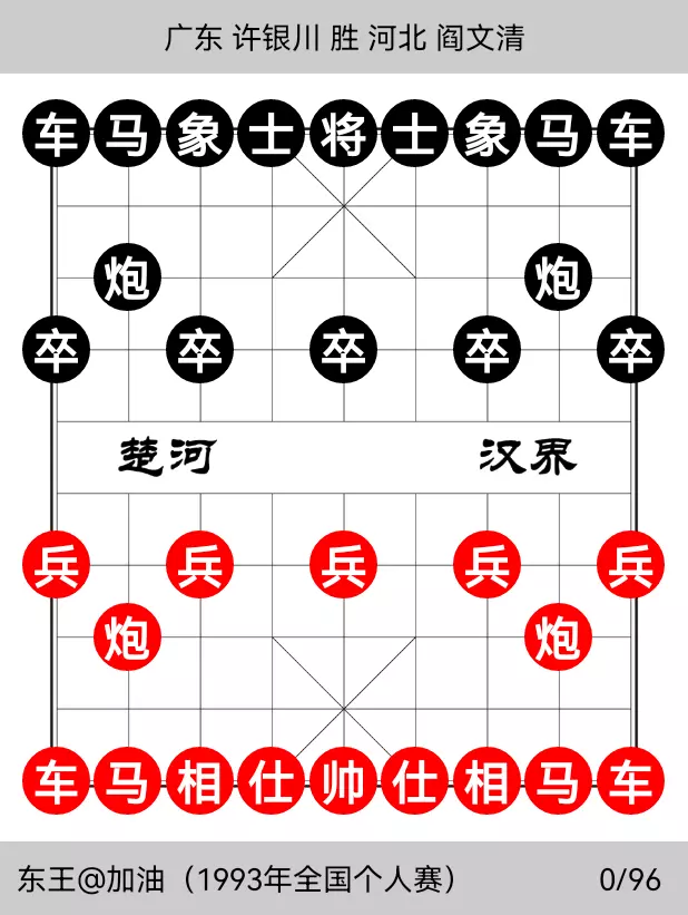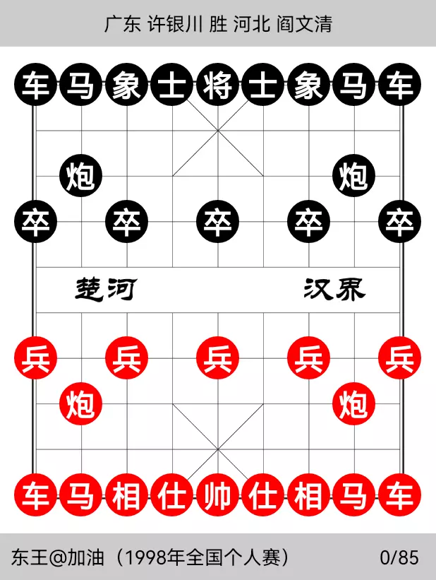 时间回到1998年的全国象棋个人锦标赛上。这次比赛在风景如画的深圳银湖旅游中心进行,比赛的冠亚军将一并获得1999年的象棋世锦赛的资格。因此比赛过程进行的异常的激烈且残酷无情。赛前被普遍看好的吕钦,赵国荣特大等均被其他高手围追堵截而名落孙山。但同时引人注目的是河北高手闫文清一路顺风顺水,有如神助,前十轮5胜5和,暂时占据积分榜的榜首。尤其是第十轮对阵“东北虎”赵国荣特大的对局,闫在马炮残局的对弈中游刃有余,丝丝入扣,弈来相当精彩,第一次将赵斩于马下,迎来了参加全国赛以来的最好的夺冠机会。最后一轮抽签,结果是由当时如日中天的许银川对阵闫文清,许特大如想夺冠的话,许胜不许和,而闫则只需一盘和棋即可完成登顶。比赛开始,许银川使出了五七炮弃双兵的激烈变化,求胜欲望跃然棋盘。过程如下: