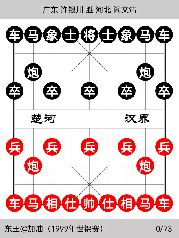 次年,作为上一年的亚军的闫文清和冠军的许银川特大携手参加了象棋世锦赛。前五轮闫文清大师发挥出色,以新颖的布局,刚柔并济的棋风而所向披靡,前五轮5战5胜。下面作为领头羊的闫又和许银川特大不期而遇,执先的许特大采用的中炮缓进兵的阵势攻打闫大师的屏风马布局,比赛的结果依然是闫负许胜,棋谱如下:
