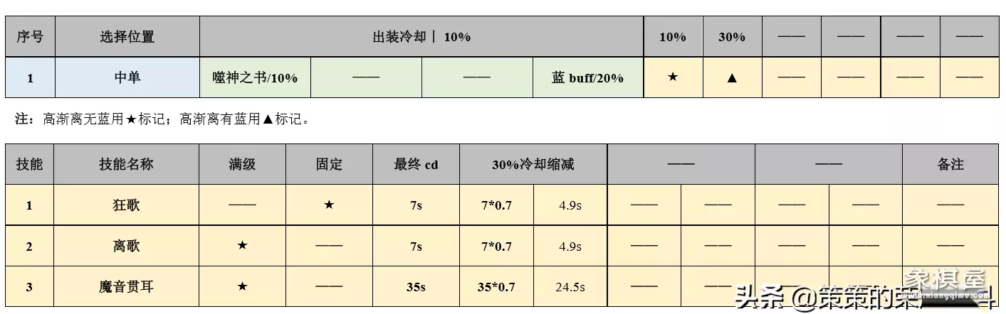一技能为固定冷却7s,满级二技能冷却也为7s,在出到噬神之书且控蓝的情况下拥有30%冷却,一二技能cd分别为4.9s,在大招5s过程中只能释放一次1/2获得2层印记。