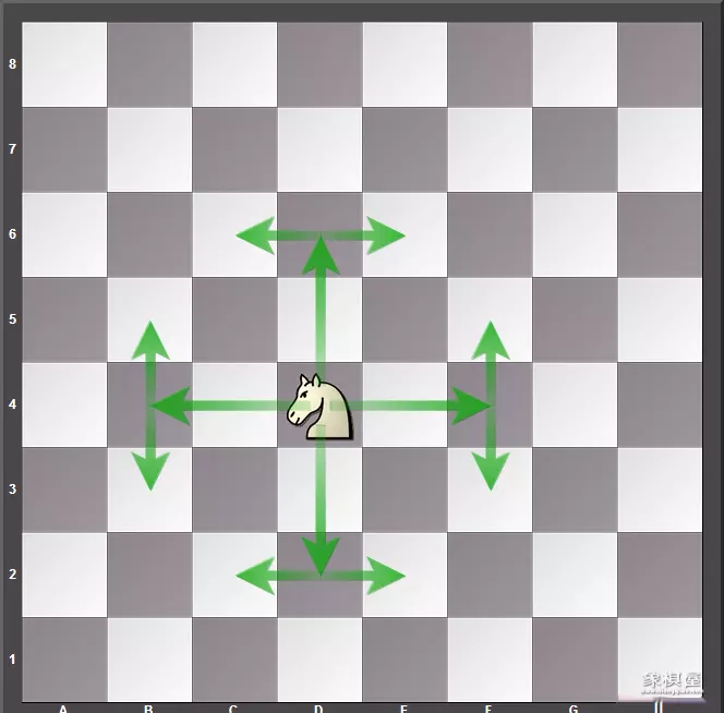 马在d4的时候可以控制c6、e6、f5、b5、e2、c2、f3、b3一共八个格子。可以发现马走过一次之后,改变了它所占的格子的颜色。马在d4是黑格,但是他跳到的八个格子都是白格。马在棋盘的角落上活动力最小,只有两种路线可以走。