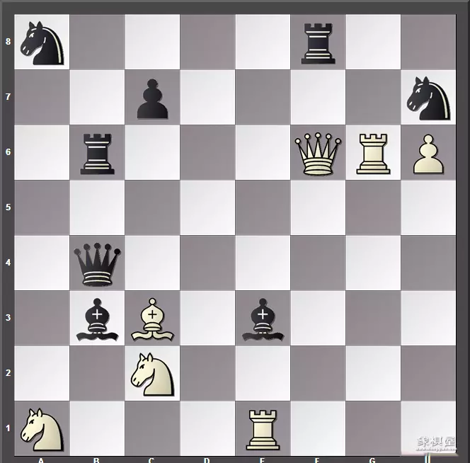 上图白马能吃b3黑象,但是不能走到c2,因为那里有己方的另一个马。c2马幼四种走法,a3、d4、b4、e3,但是他不能走到a1和e1,因为有己方的棋子占据。a8的马没有任何位置可以去,因为b6和c7被黑方棋子占据,h7的黑马可以走到g5或者f6吃掉白后,但是不能走到f8,因为被己方的车占据。马的力量大致与象相等,强于兵若于车。