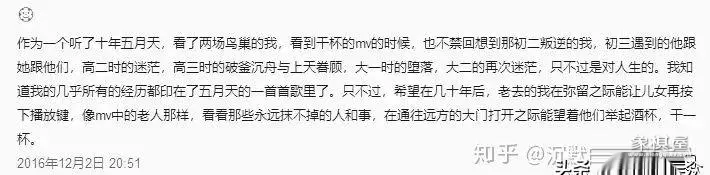 一个人一生会遇到很多人,会交很多朋友,但是随着各种各样的原因,很多人中途都会离开,很多友情都会变淡,只有极少数的人可以陪我们走完很多很多年。而人生中最珍贵的友情就是互相陪伴走完人生最好的时光,无论发生什么都依然如初。一直到今天,想起高中睡在我下铺的闺蜜,跟她推荐了这首《干杯》,其实我的本意是想说“想你了,要不要一起来喝一杯”,结果她说“我想到了我们艺考的时候,心情不好你说陪我喝酒,结果你就真的只是陪,不带喝的。”哈哈哈哈哈,为什么如此煽情的时刻,你要说这么好笑的事情。