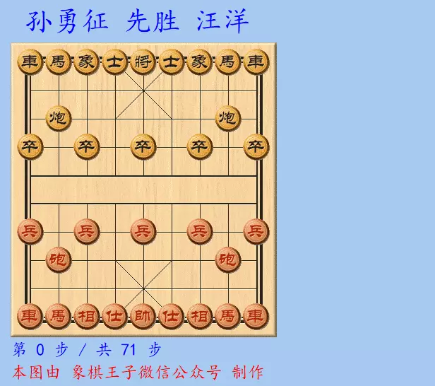 红方步步为营,孙勇征战入车马双兵仕相全对车马卒单缺象,多相多兵下,再困住黑马,71手一举得胜。