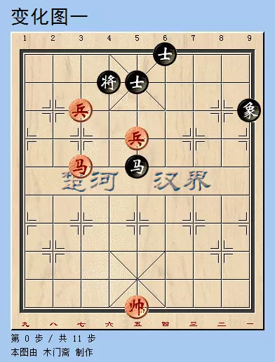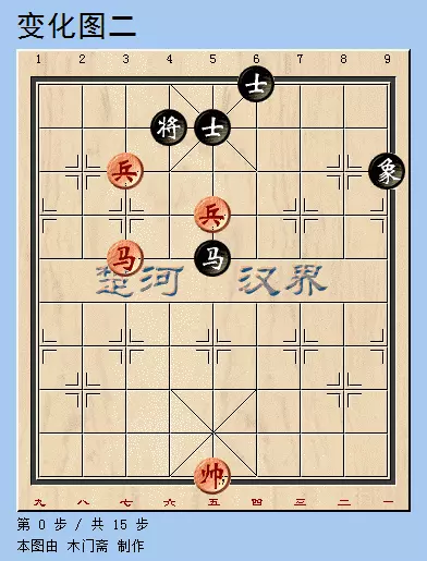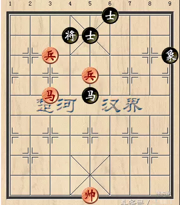 注解:鉴于前一变例黑方无法防守,黑方就逢危须弃!最终形成了一个马底兵对单士象的实用残局。这就又给红方提出了新的难题。看上去黑方将士互保,门东户西,似乎红方无计可施!真得吗?