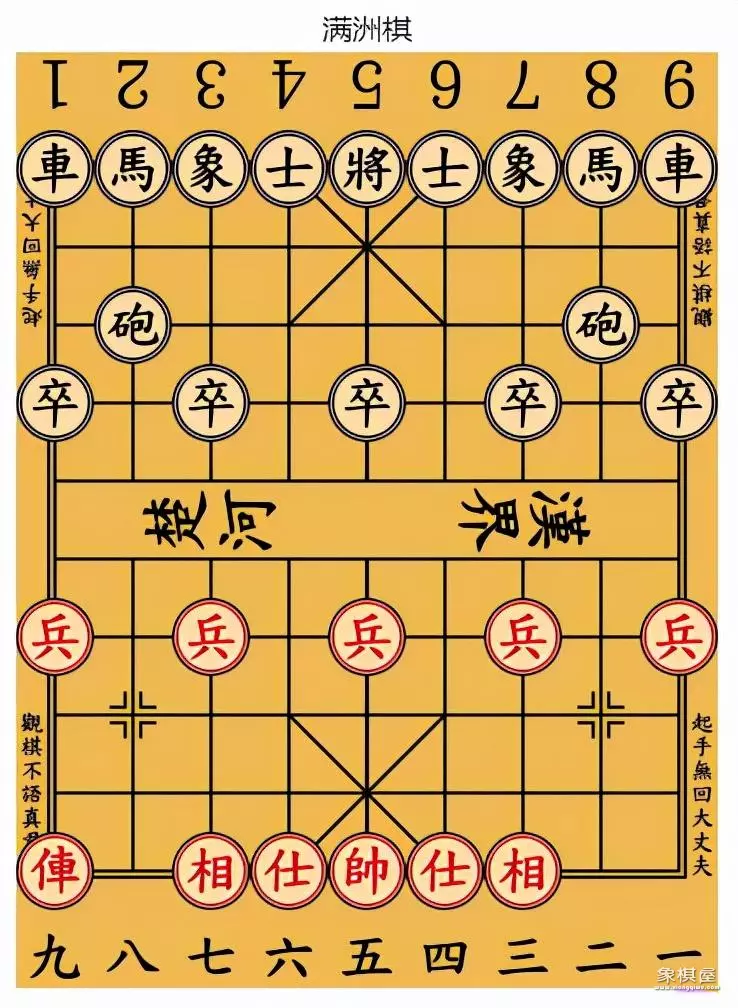 在清朝的时候,还流传出一种据说为了歌颂统治者的勇武所演变出的满洲棋,其中红方需要让出一车、双马、双炮,同时让最后剩下的一车同时拥有车马炮的能力,让它单枪匹马奋勇杀敌。