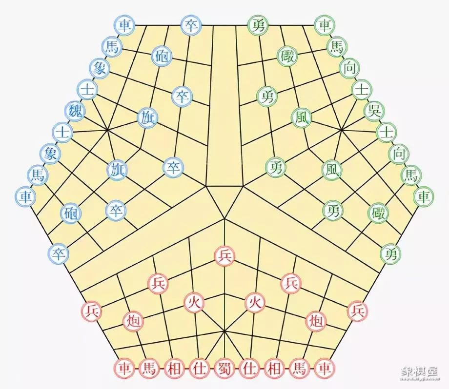 除此之外,还有人从三国演义中汲取了灵感,将棋盘改成了6方棱形,允许三人共弈开黑。