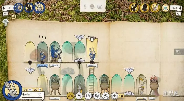 还有一些辅助技能。比如“推动”可以将敌人推到不利地形中或者地图边缘杀死;“祝祷”可以给小动物附加光环,提供无法被推动和伤害与命中率增加的buff。还有唤醒(赋予额外回合)、诅咒(上debuff)等等,甚至还有让兔子或者驴“给敌人看看屁股”和“放屁”这种非常黑色幽默的晕眩技能……卷轴之外的玩家还有“亲手技能”,能够打破次元壁直接攻击或移动小动物和代表自己的墨法师。这些技能非常有效,但冷却时间较长。