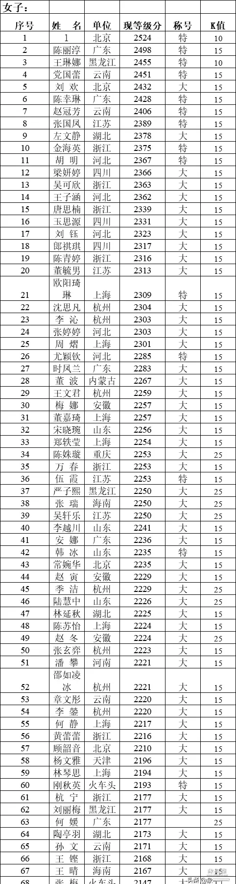 女子棋手,一共有68位上榜最新一期的等级分女子选手榜单。