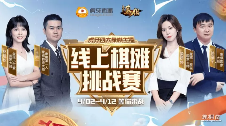 在4月2号到12号期间,某牙将联合天天象棋掀起一场初夏时节的对弈狂欢。为了增加比赛的分量,邀请到了象棋界的实力大咖王天一、孙浩宇、林延秋、梁妍婷,届时玩家们将有机会和他们交手。