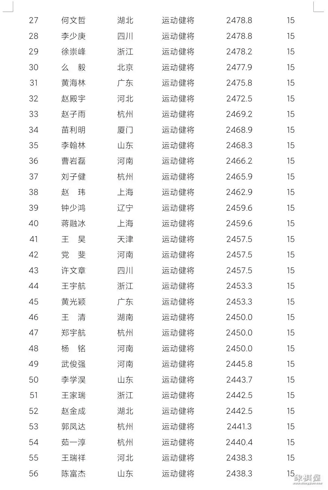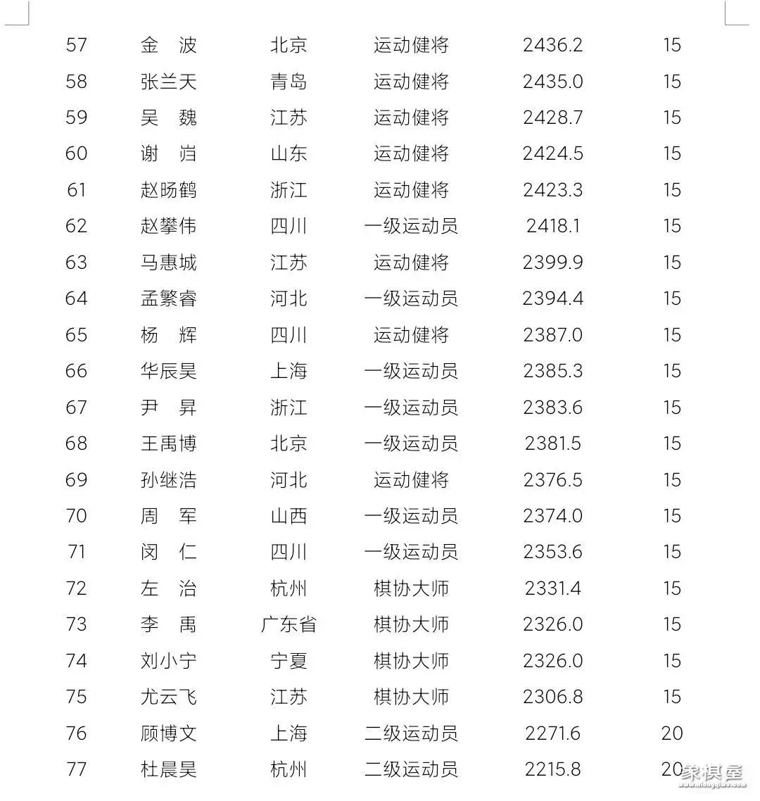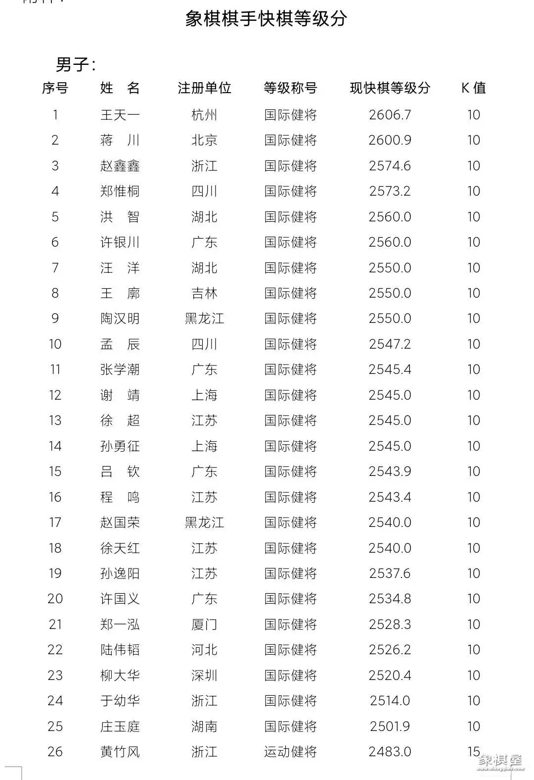 象棋棋手快棋等级分:男子