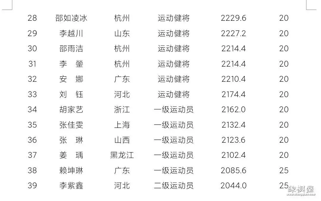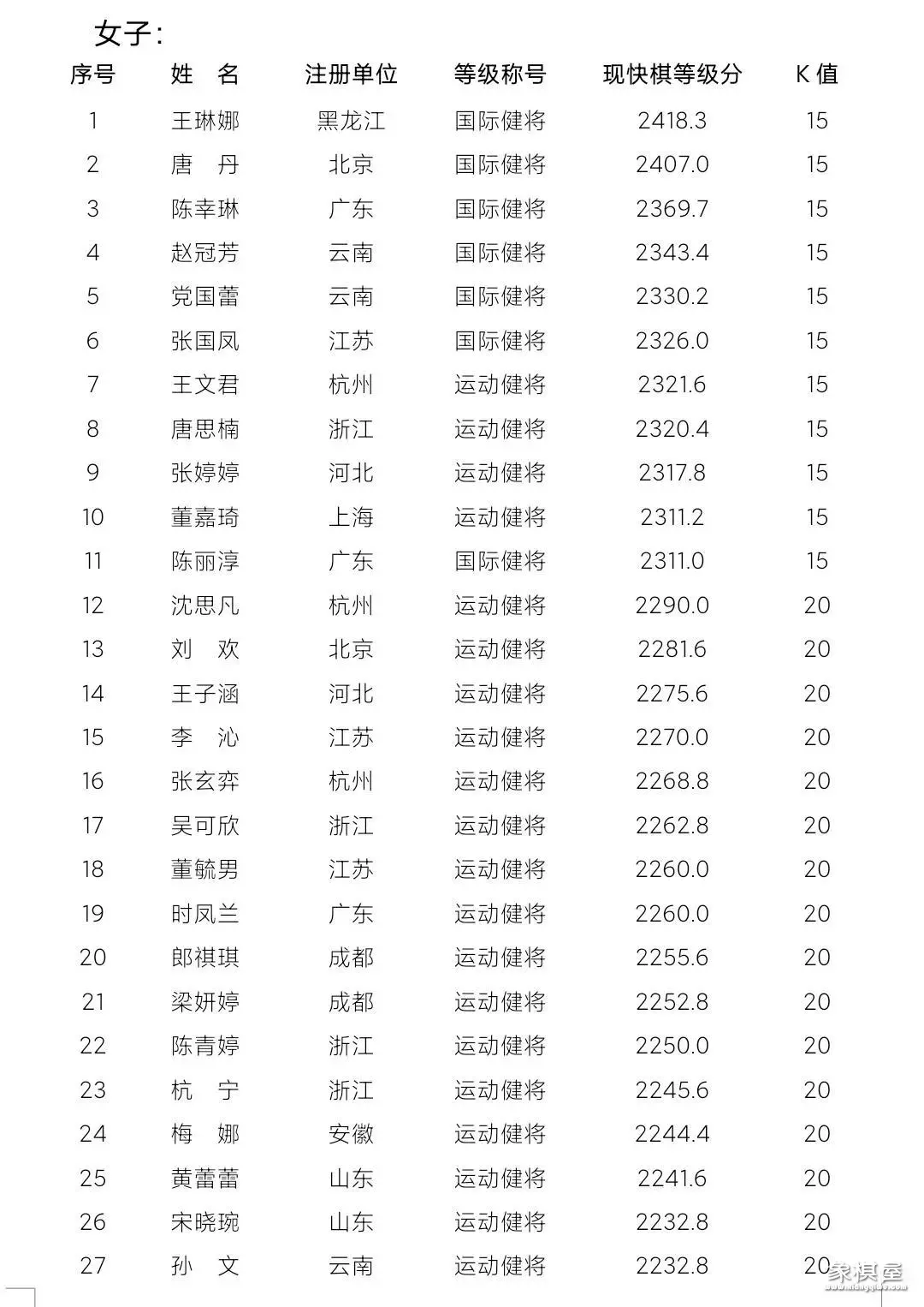 象棋棋手快棋等级分:女子