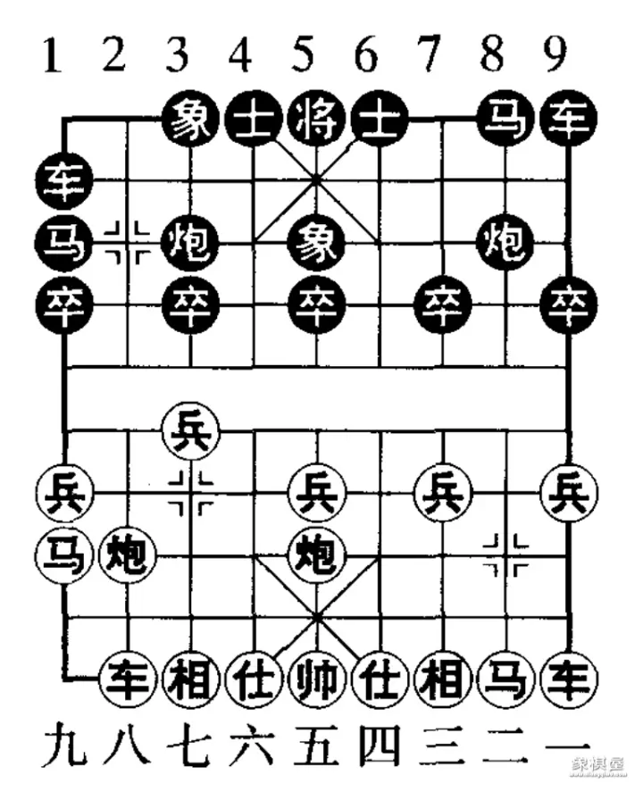 在如图5时,红方可以针对巡河炮而演成多种布局:①兵三进一,卒3进1,炮八平七,象3进5,马八进九,马2进3,车九进一,成“五七炮进三兵对屏风马左炮巡河”。