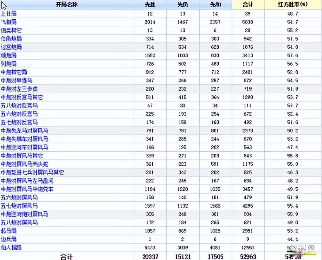 所以三七路是天然的布局焦点斗争路线,还有一个佐证,笔者去查阅了一个知名的象棋网站,那里统计了几年之内的著名对局。发现仙人指路开局的胜率最高:59.5%,各位大神思考一下这是为什么?