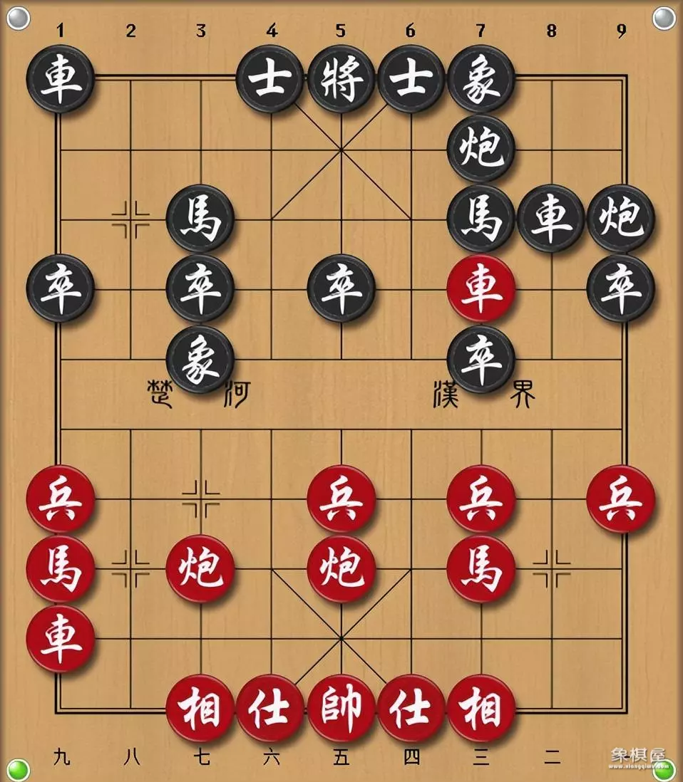 下图是中炮过河车互进七兵对屏风马平炮兑车,黑方将从7路线展开反击