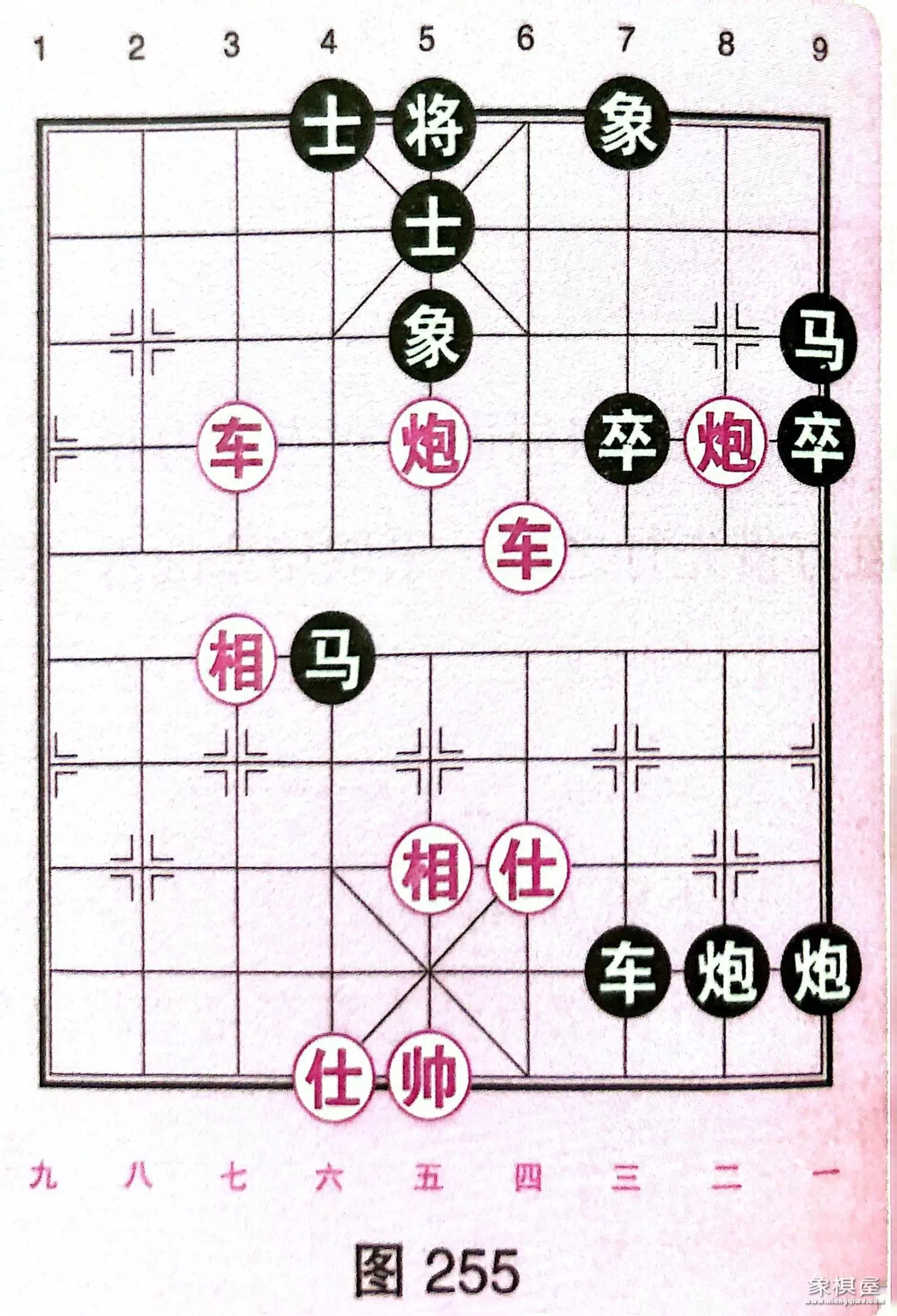 如图254局面,双方子力相当,但黑缺士露将,处于被动受攻的局面。