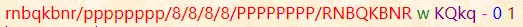 这表示在当前局面下每一方有没有潜在的各种王车易位的可行性(目前不一定行,但以后有可能行)。如果谁都没有,就用“-”表示;大写“k”表示白方有短易位的可行性,大写“q”表示白方有长易位的可行性;对应的小写“k”和“q”代表黑方短和长易位的可行性。书写顺序必须是先大写后小写、先短易位后长易位,并且之间不能有空格。