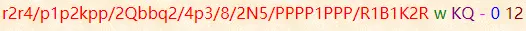 假如从开局开始,走了1. e4 e5 2. nf3 nc6 3. bc4 nf6 4. ng5 d5 5. exd5 nxd5 6. nxf7 kxf7 7. qf3+ qf6 8. bxd5+ be6 9. bxc6 bxc6 10. qxc6 bd6 11. nc3 rhd8