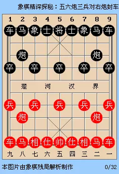 小结:五六炮挺三兵对反宫马,双方均右翼开扬左翼受制,红右车过河压马,黑如消极保马则处于守势,但可弃马抢攻,所以红方稳健之着是兑车后亮出左车,仍能掌握先手。