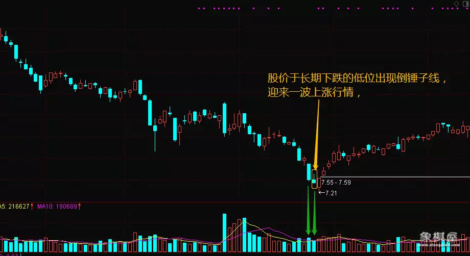 ①当股票于长期下跌的低位出现倒锤子线,预示后市出现反弹甚至反转的几率非常大。简单来讲,倒锤子线次日若是一根实体较长的阳线,则上涨信号更强烈。