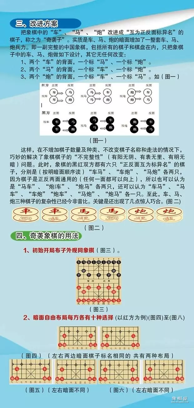 所以,变革象棋,让它有更多的变化,最好的途径是让棋局存在“不可知”因素,这就是“不完(美)全信息”状态,只有这样的变化,才是无限的。这样的变化可以始终在“是否中循环”,《孙子兵法》“战势不过正奇,正奇之变不可胜穷也”、“如循环无端,孰能穷之?”