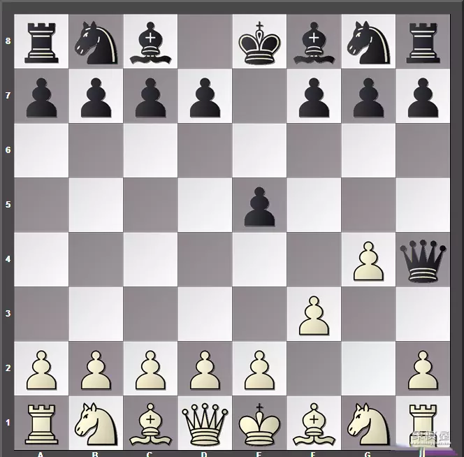 白方开局的时候犯了大错,在第二回合就被将杀,这是国际象棋中可能出现的最短对局,被称为傻瓜杀局。白方第一步走f3,开放了王被攻击的线路,同时阻挡了g1马要出动的最好的格子。黑方走e5,占领了中心格,同时开放了f8象和后的斜线。白方g4,依然没有出动子力,而且完全暴露了王被攻击的线路,黑方qh4直接将杀。