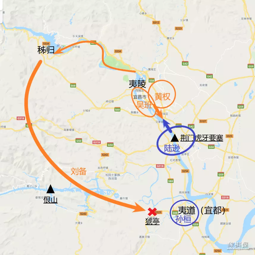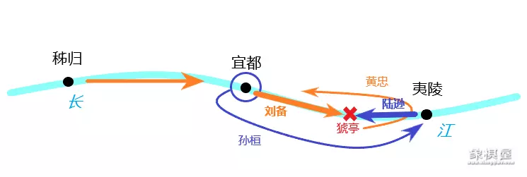 西塞地势险要,从水陆两路进攻都很困难。因此,刘备在此地与吴军相持一段时间后,就回师秭归了。回师是在正月,二月,刘备就又率军从秭归出发,沿陆路“缘山截岭”进军到夷道猇亭。同时,派黄权率领江北诸军,与吴军相拒于夷陵道。如图所示: