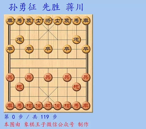 加赛快棋,孙勇征先手仙人指路对挺卒,红右中炮、黑飞右象的棋,红方布局迅速谋卒。