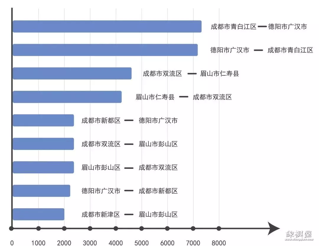 一个明显的趋势是,跨城通勤者更愿意选择城际毗邻地区就业。从行政区的层面来看,双流区是最受跨城通勤族欢迎的工作地点,终点为双流区的跨城通勤者为8000余人次,其次为青白江区。流入成都市域跨城通勤者的前三位居住地分别是德阳广汉市、眉山仁寿县和眉山彭山区,前两者也是成都人选择跨城通勤的首选区域。