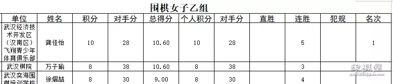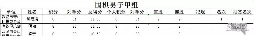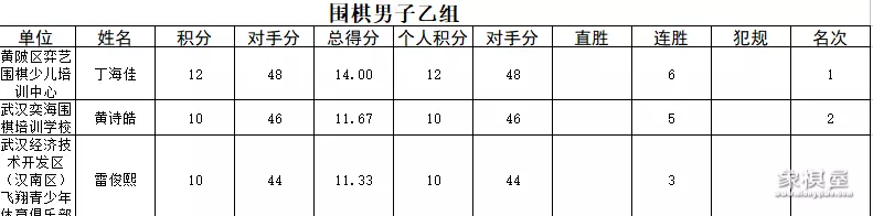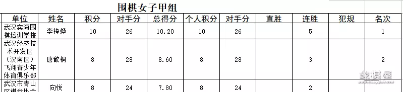 其中围棋项目,男子甲组武汉市青山区棋类协会熊晟瑞同学获得第一名,男子乙组黄陂区弈艺围棋少儿培训中心丁海佳获得第一名。女子甲组武汉奕海围棋培训学校李梓桦同学获得第一名,女子乙组武汉经济技术开发区(汉南区)飞翔青少年体育俱乐部龚佳怡同学获得第一名。