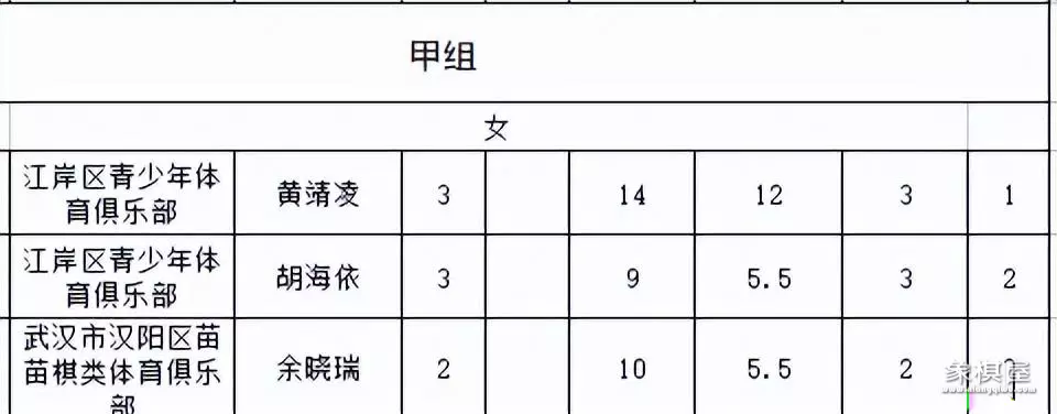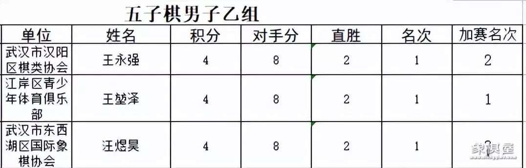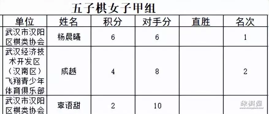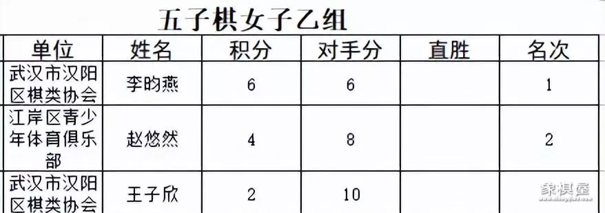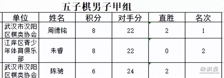 五子棋项目,男子甲组武汉市汉阳区棋类协会周德铭同学获得第一名,男子乙组江岸区青少年体育俱乐部王堃泽同学获得第一名。女子甲组武汉市汉阳区棋类协会杨晨曦同学获得第一名,女子乙组武汉市汉阳区棋类协会李昀燕获得第一名。