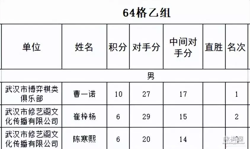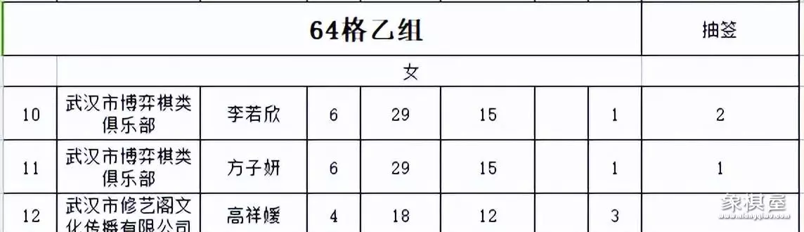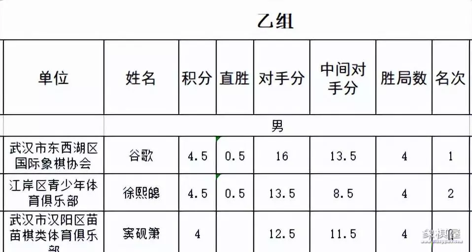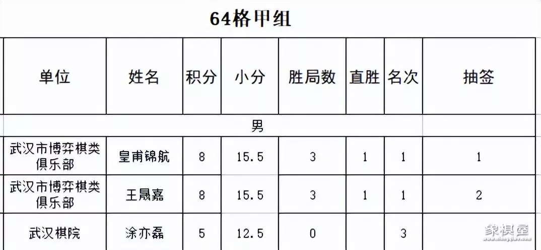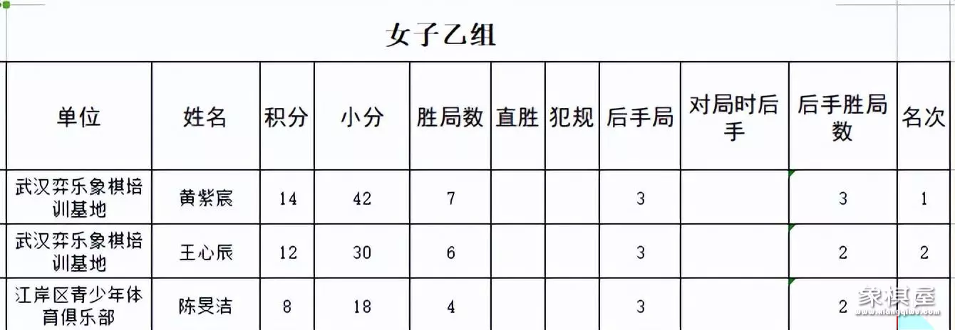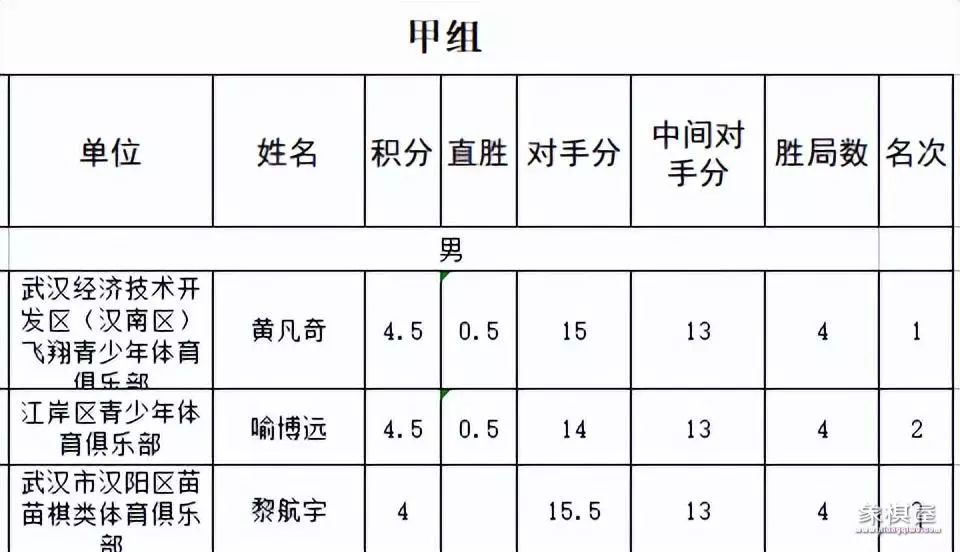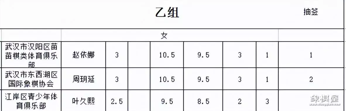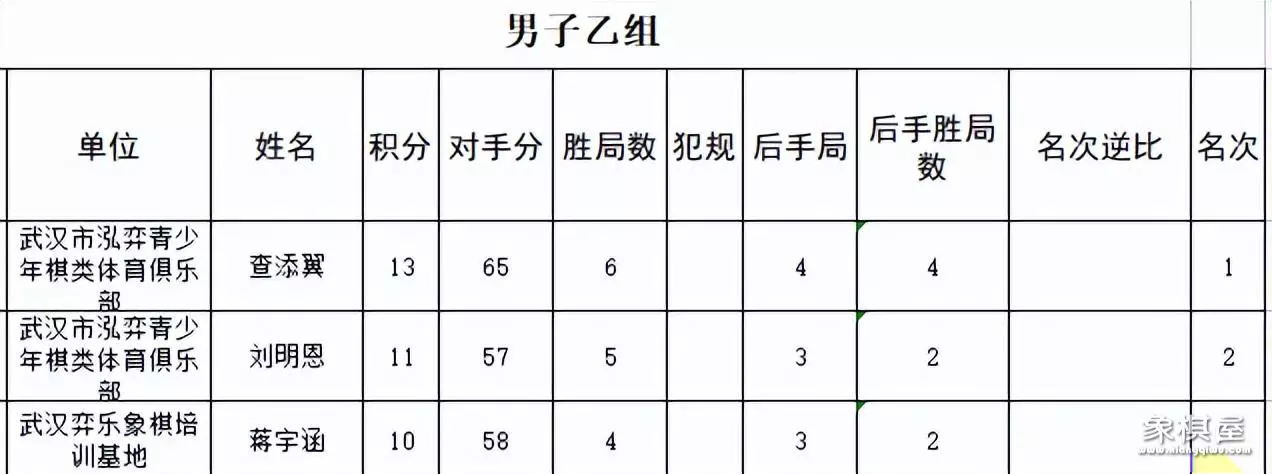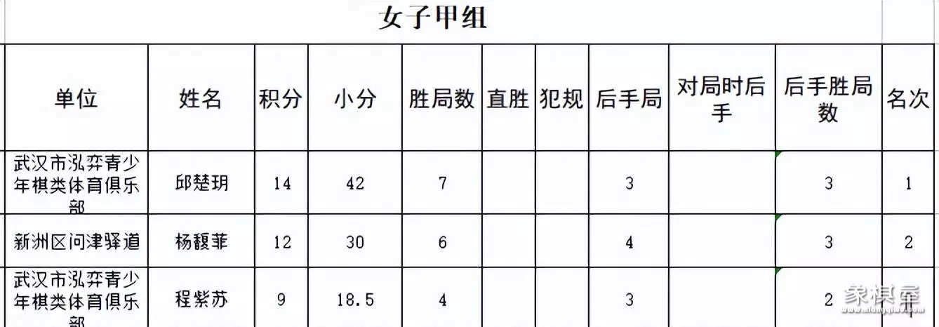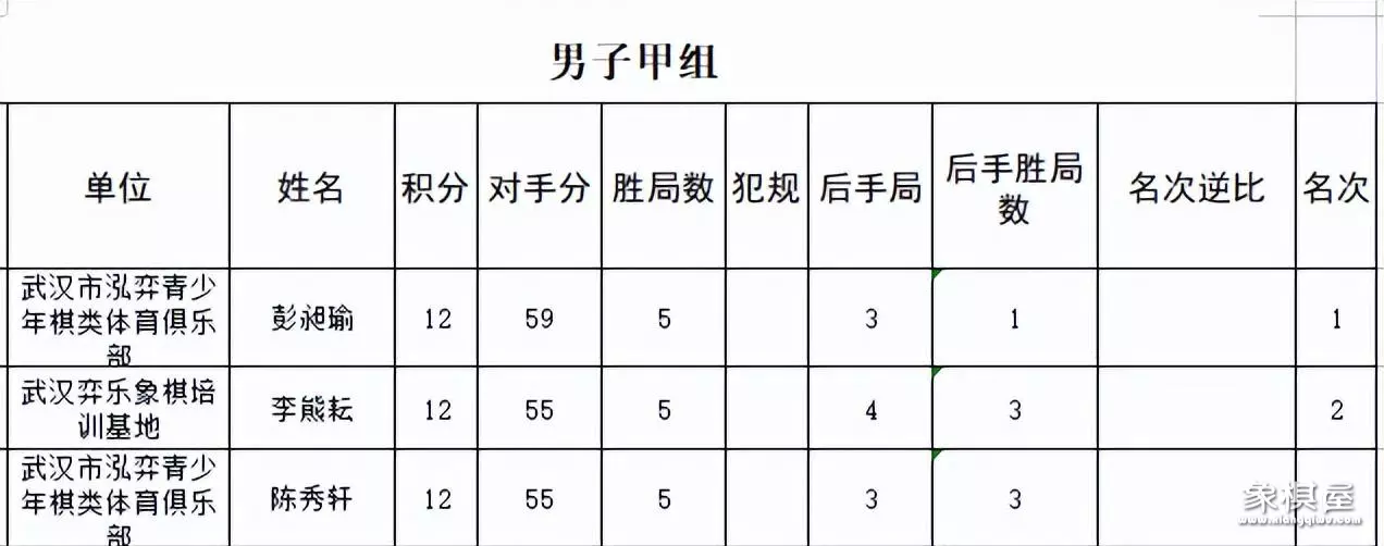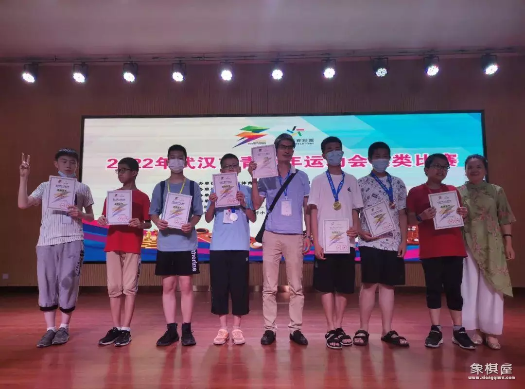 象棋项目,男子甲组武汉市泓弈青少年棋类体育俱乐部彭昶瑜同学获得第一名,男子乙组武汉市泓弈青少年棋类体育俱乐部查添翼同学获得第一名。女子甲组武汉市泓弈青少年棋类体育俱乐部邱楚玥同学获得第一名,女子乙组武汉弈乐象棋培训基地黄紫宸同学获得第一名。