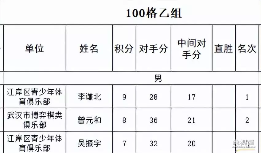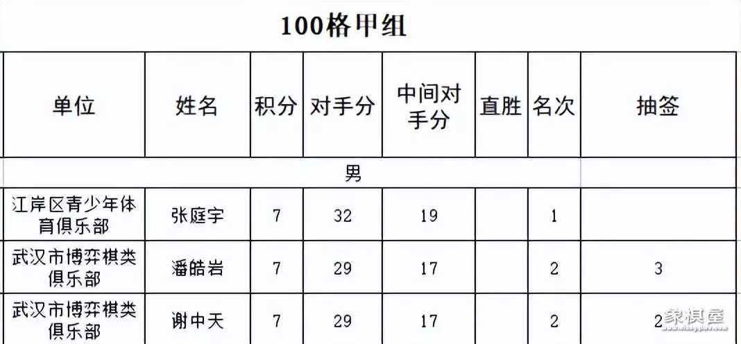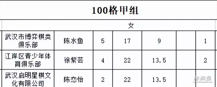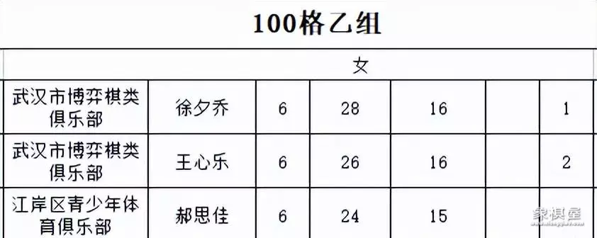 100格男子甲组江岸区青少年体育俱乐部张庭宇同学获得第一名,男子乙组江岸区青少年体育俱乐部李谦北同学获得第一名。女子甲组武汉市博弈棋类俱乐部陈水鱼同学获得第一名,女子乙组武汉市博弈棋类俱乐部徐夕乔同学获得第一名。