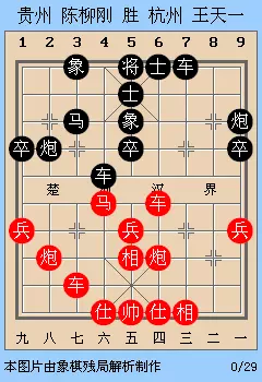 在两天的交战过程中,王天一4胜10和1负,唯一输的一局是对战贵州棋王陈柳刚。王天一执黑,与陈柳刚以中炮七路马对屏风马对战到第18回合的局面如图所示。