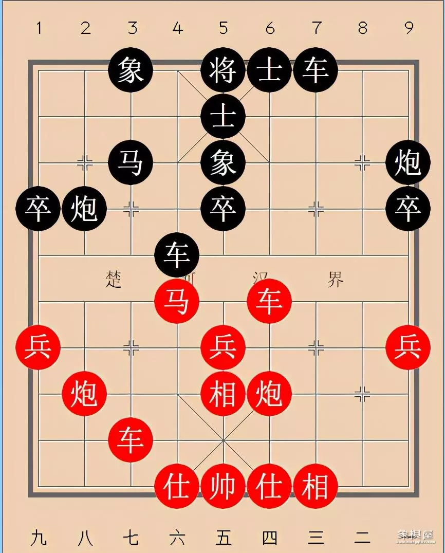 双方子力相等,红方车马巡河,双炮连环。黑方一车挡住红马,边炮守住黑马,各子力也正伺机进攻。现在轮到红方: