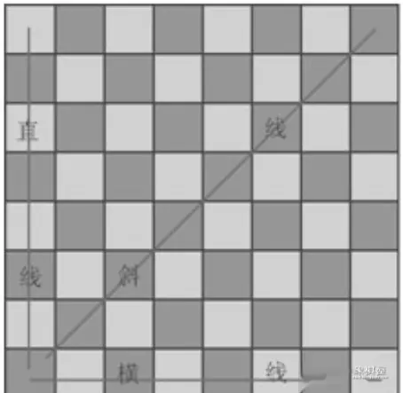黑白64个方格构成的棋盘上,共有8条直线、8条横线以及26条由不同颜色组成的斜线。如下图。