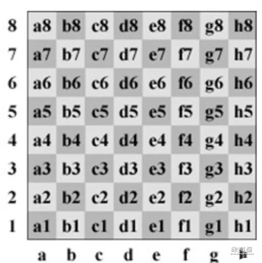 棋盘是国际象棋的战场,初学者一定要花功夫去熟悉棋盘。因为国际象棋规定是白方先走的,所以在命名直线和横线代号时,也以白方为标准。8条直线从白方的左边到右边分别用a、b、c、d、e、f、g、 h这8个小写拉丁字母表示;8条横线从白方到黑方分别用1、2、3、4、5、6、7、8这8个阿拉伯数字表示。因为每个方格都是直线和横线的交叉点,所以 它们可用直线的拉丁字母和横线的阿拉伯数字结合起来表示,使每个方格也都有了自己的名称,如下图。