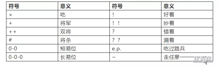 后从d1格走到d5格,记为后d5,原来位置不记,只记棋子的名称和到达的位置。兵从e2格走到e4格,记为e4,兵的名称可以省略。象从c1 格走到h6格吃掉对方的棋子,记为象×h6。d×c4表示兵从d5格吃掉对方对方c4格的棋子。车从a1格走到a8格吃掉对方的棋子将军,记为r×a8+。兵升变时在兵的着法后面加上新棋子的名称,e×d1后+表示黑兵从e2格吃掉白方d1格的棋子升后将军。a8马#!表示兵从a7格走到a8格升变为马将杀 对方,并且是一步好棋。