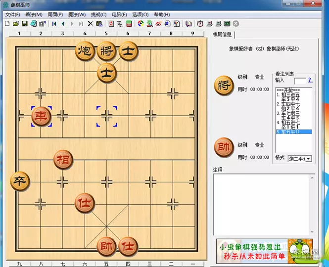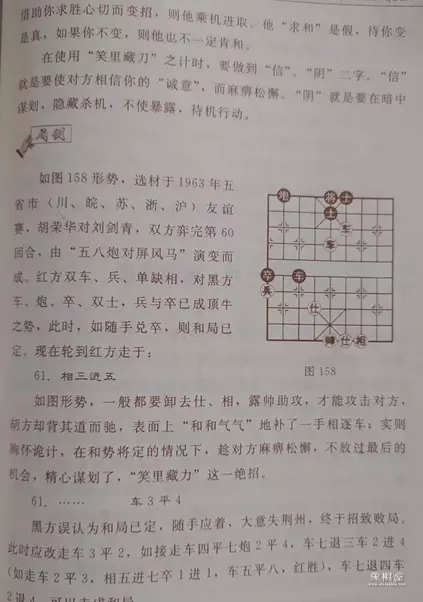 如图形势,一般都要卸去仕、相,露帅助攻,才能攻击对方胡方却背其道而驰,表面上“和和气气”地补了一手相逐车;实则胸怀诡计,在和势将定的情况下,趁对方麻痹松懈,不放过最后的机会,精心谋划了,“笑里藏力”这一绝招。