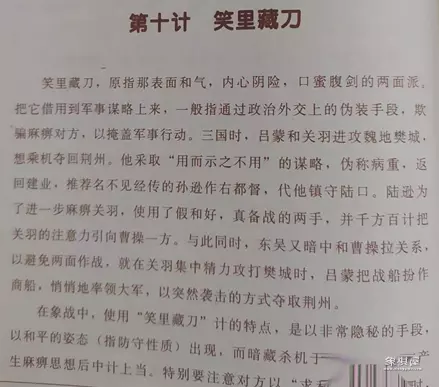笑里藏刀,原指那表面和气,内心阴险,口蜜腹剑的两面派。把它借用到军事谋略上来,一般指通过政治外交上的伪装手段,欺骗麻痹对方,以掩盖军事行动。三国时,吕蒙和关羽进攻魏地樊城,想乘机夺回荆州。他采取“用而示之不用”的谋略,伪称病重,返回建业,推荐名不见经传的孙逊作右都督,代他镇守陆口。陆逊为了进一步麻痹关羽,使用了假和好,真备战的两手,并千方百计把关羽的注意力引向曹操一方。与此同时,东吴又暗中和曹操拉关系,以避免两面作战,就在关羽集中精力攻打樊城时,吕蒙把战船扮作商船,悄悄地率领大军,以突然袭击的方式夺取荆州。
