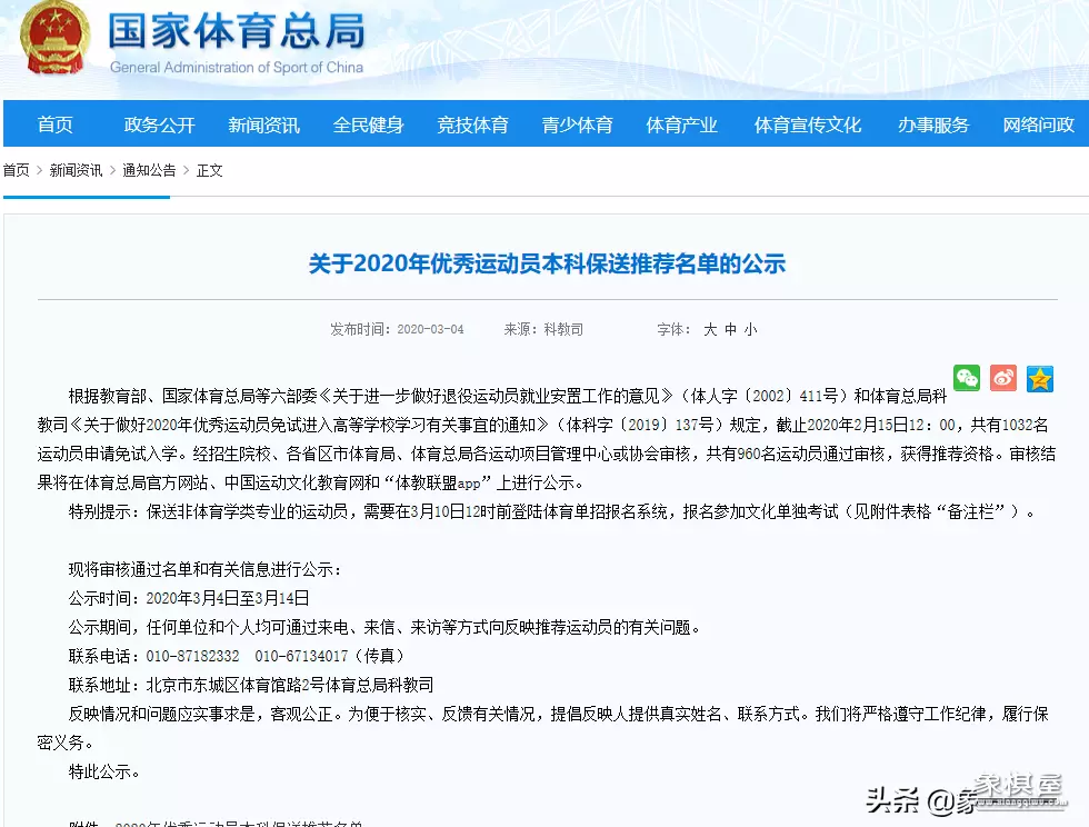 《关于2020年优秀运动员本科保送推荐名单的公示》通知显示,发布时间2020-03-04,正文部分:根据教育部、国家体育总局等六部委《关于进一步做好退役运动员就业安置工作的意见》(体人字〔2002〕411号)和体育总局科教司《关于做好2020年优秀运动员免试进入高等学校学习有关事宜的通知》(体科字〔2019〕137号)规定,截止2020年2月15日12:00,共有1032名运动员申请免试入学。经招生院校、各省区市体育局、体育总局各运动项目管理中心或协会审核,共有960名运动员通过审核,获得推荐资格。