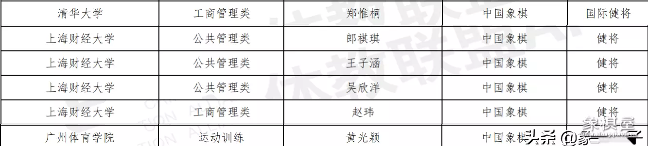 北京时间3月5日,根据国家体育总局官方网站发布的《关于2020年优秀运动员本科保送推荐名单的公示》,六名中国象棋运动员:象棋世界冠军郑惟桐保送清华大学,象棋大师赵玮、郎祺琪、吴欣洋、王子涵保送上海财经大学,象棋大师黄光颖保送广州体育学院。