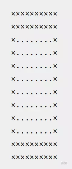 所以,我们需要在棋盘周围添加 2 个棋格大小的填充,即创建一块 12x12 的棋盘,用一个线性数组来表示。但其实,我们只需要一块 12x10 的棋盘,因为上一行最右边的填充也可以作为下一行最左边的填充,如下所示(x 代表填充):