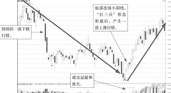 “红三兵”形态是指连续阴线后又连续拉出三根阳线(红色),短期有上扬空间。通常,股价在底部区域经过较长时间的盘整,连续拉出三根阳线才叫“红三兵”。如图2-1所示。