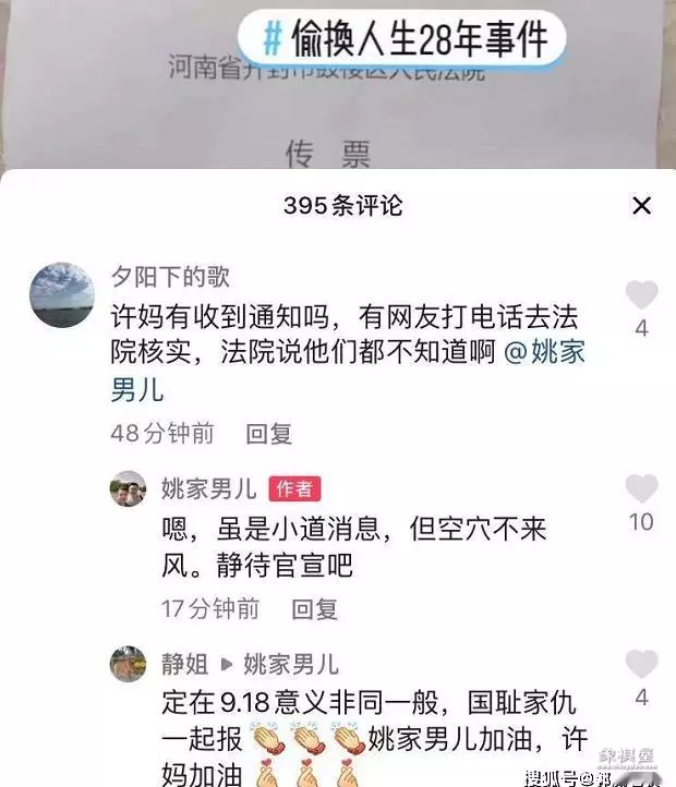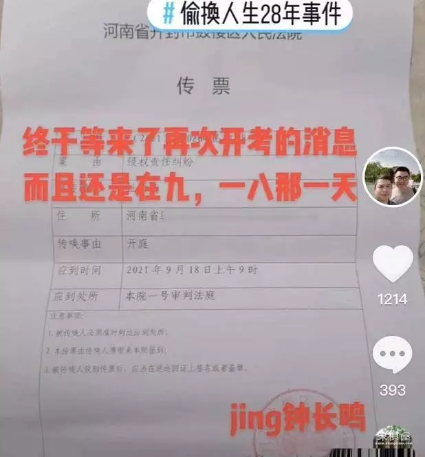 9月6日,“错换人生28年”许敏等人起诉河南大学淮河医院、杜新枝侵权责任纠纷一案将于9月18日开庭。最近“姚家男儿”以及“堂嫂”同时发布了一张照片,配文是终于等来再次开庭的消息,照片中的信息显示这是来自河南当地人民法院的传票,错换人生案这是准备二次公开审理了吗?