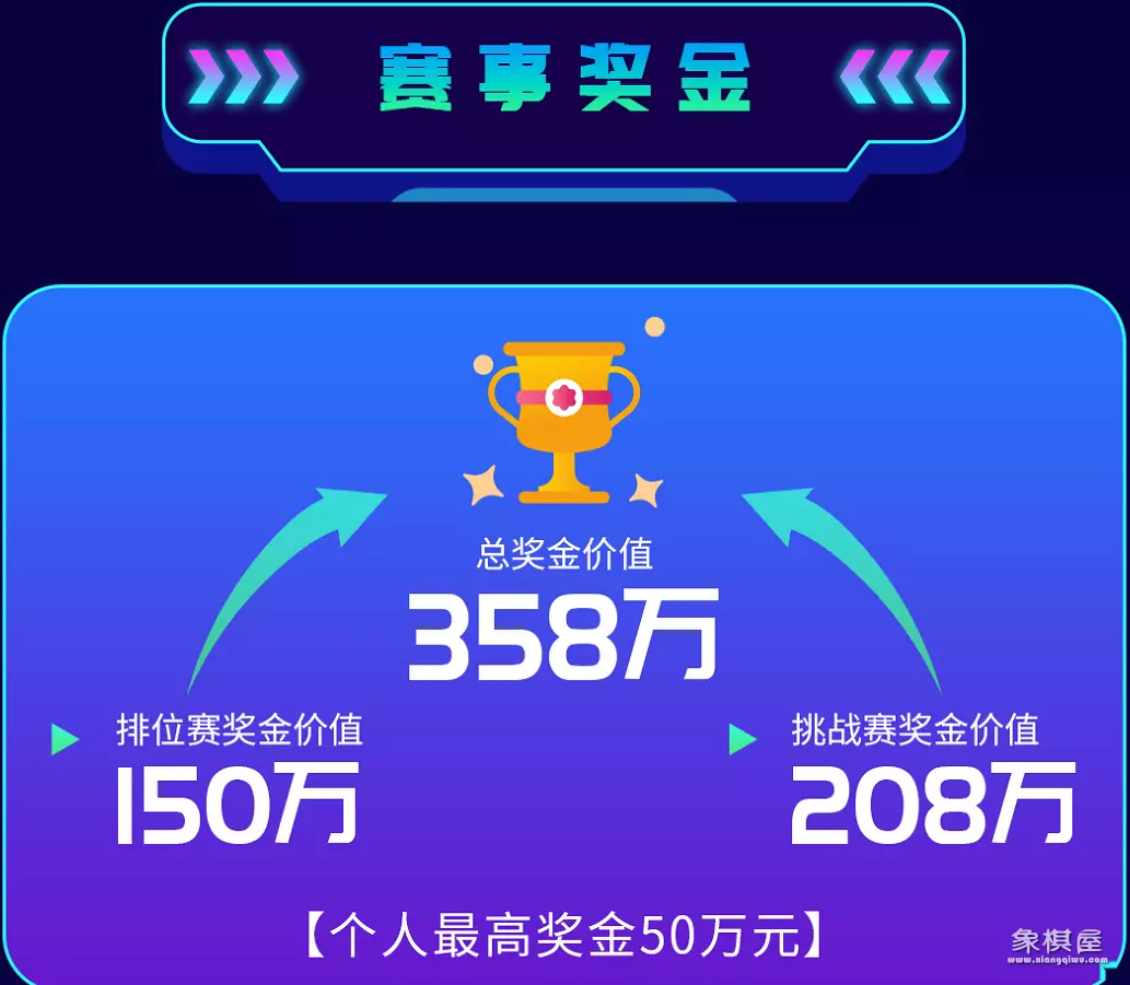 总奖金达百万,成人组冠军奖金五十万,亚季军、其余名次另有5万、1.5万等不同奖励,青少年组冠军四万,亚季军、其余名次另有2万、1.5万、1万等不同奖励。