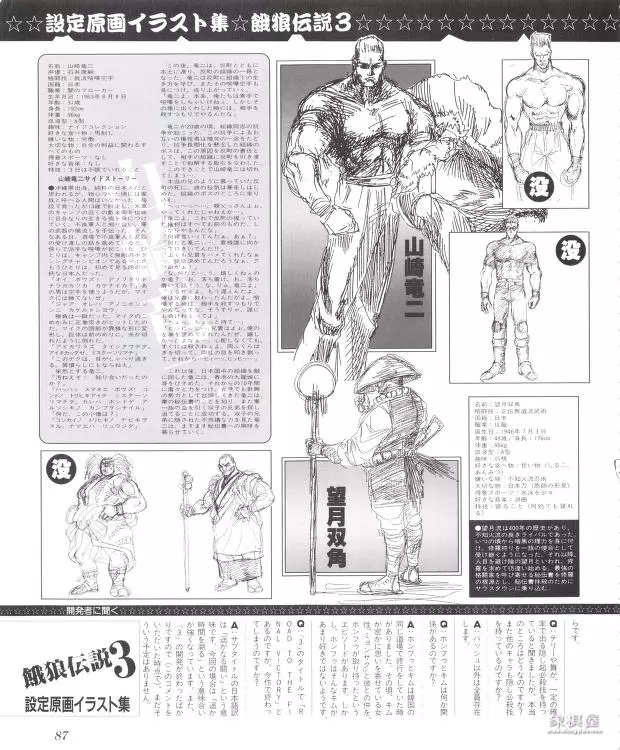 众所周知,游戏角色只要所在作品有了续作,那么设定多多少少都会有所改变,这是常有的事。但是某些角色就完全不同,比如...山崎龙二....与其他角色不同,山崎的设定可以说是每作都有明显的变化..而且是越变越边缘化...所以,还是简单闲扯一下吧。饿狼传说3时期初登场的饿狼3中,山崎被设定为是一个【相当理智、精于算计,将疯狂隐藏在心底】的‘普通’人。