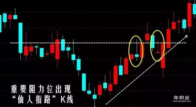 1、在重要的阻力位出现仙人指路k线。长长的上影线,看似是股价向上突破阻力位不太成功,盘中遭受到较大的抛盘压力,使得股价冲高后回落。但其实很可能是股价即将突破前的一种蓄势待发或者是主力拉升股价之前的短暂洗盘过程。
