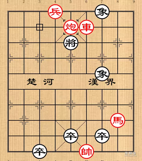 淮阴遇汉:淮阴,县名。“楚汉三杰”之一韩信,被封为“淮阴候”,即指此地。图1如图1,着法红先胜:1.车三进一,将6进1。2.马四进二……(图2中的第1种变化)图2如图2的第2种变化,如红方改走炮五平四?则马4退6(如误走马4进6去炮则劣,以下马四进二,将6进1;车三退二,抽将红可速胜);马四退六,马6退5;马六退四,马5进6;马四进六,马6退5;红无连杀,反为黑胜。