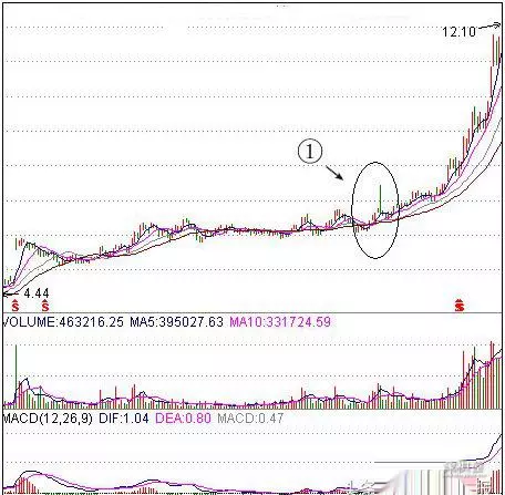 图中①处,长长的上影线突破前期高点,带有“试盘”的实战含义。出现这种“仙人指路”的试盘,后市必然会突破再创新高。其后的中阳k线吞并前面的小阴k线时,是一个介入的良机。